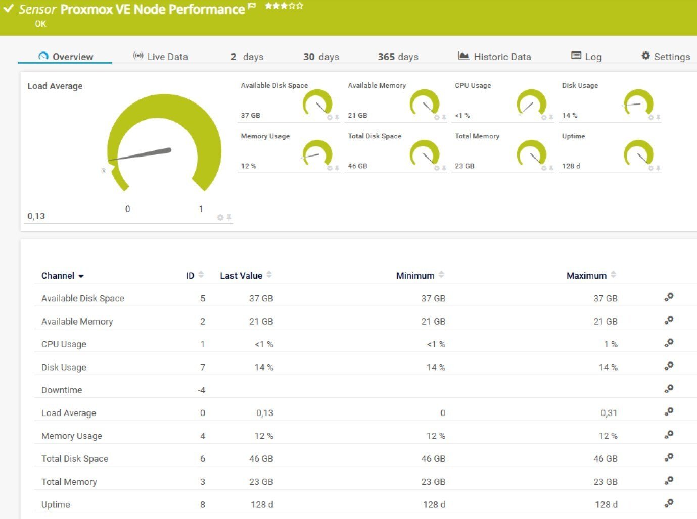One thing worth knowing about the Available Disk Space channel: it reflects the space available to non-root users, as reported directly by the Proxmox API. This excludes system-reserved blocks, so the number may look slightly lower than what you'd see at the OS level. Keep that in mind when you set your alert thresholds.